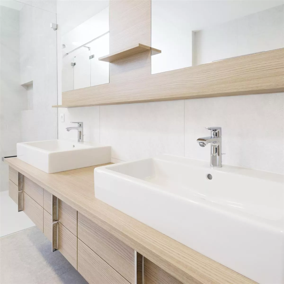 Les carreaux muraux Tirol Steinmatt de couleur blanche sont idéaux comme carreaux de salle de bain. En raison des dimensions des carreaux de 30x60 cm, la salle de bain est étirée et apparaît ainsi plus grande et plus spacieuse. C'est un très bel effet secondaire des carreaux Tirol allongés dans la salle de bain. De plus, les carreaux de pierre sont rectifiés, de sorte que les bords des carreaux muraux Tirol ont été redressés après le processus de cuisson. Ce processus d'étalonnage garantit une correspondance exacte des tailles et des bords des carreaux avec un angle de 90 degrés. Le résultat est un carrelage tyrolien précis qui permet une pose précise et des joints fins. Dans l'ensemble, un grand avantage des carreaux de salle de bain Tirol 30x60 cm, à la fois visuellement et en termes de savoir-faire. Par conséquent, rien ne s'oppose à un beau résultat de carrelage dans la salle de bain. De plus, les carreaux en faïence sont mats. L'épaisseur des dalles Tirol en pierre mate est de 8,5 mm.