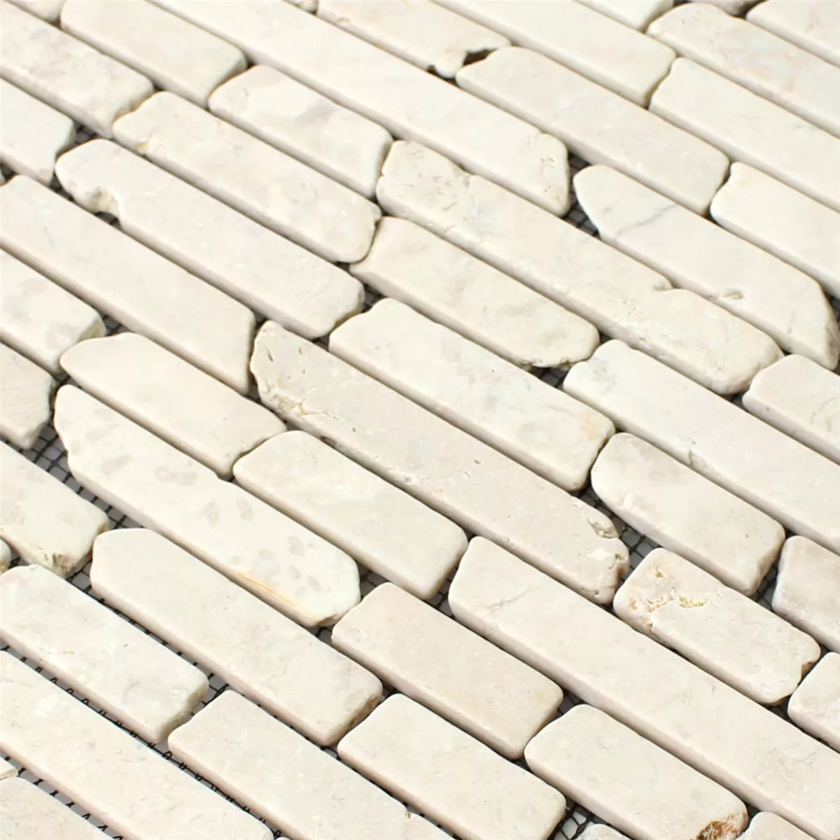 Ces carreaux de marbre beige sont idéaux pour les espaces intérieurs et extérieurs tels que les salles de bains, les cuisines et les couloirs. Ils sont résistants au gel, imperméables et antidérapants. Avec une surface mate et une classe d'abrasion 4, ils offrent durabilité et robustesse. Les tailles de pierre de 15x25 mm et 15x105 mm sont déjà montées sur un filet, ce qui facilite l'installation. La largeur du joint est de 3 mm.