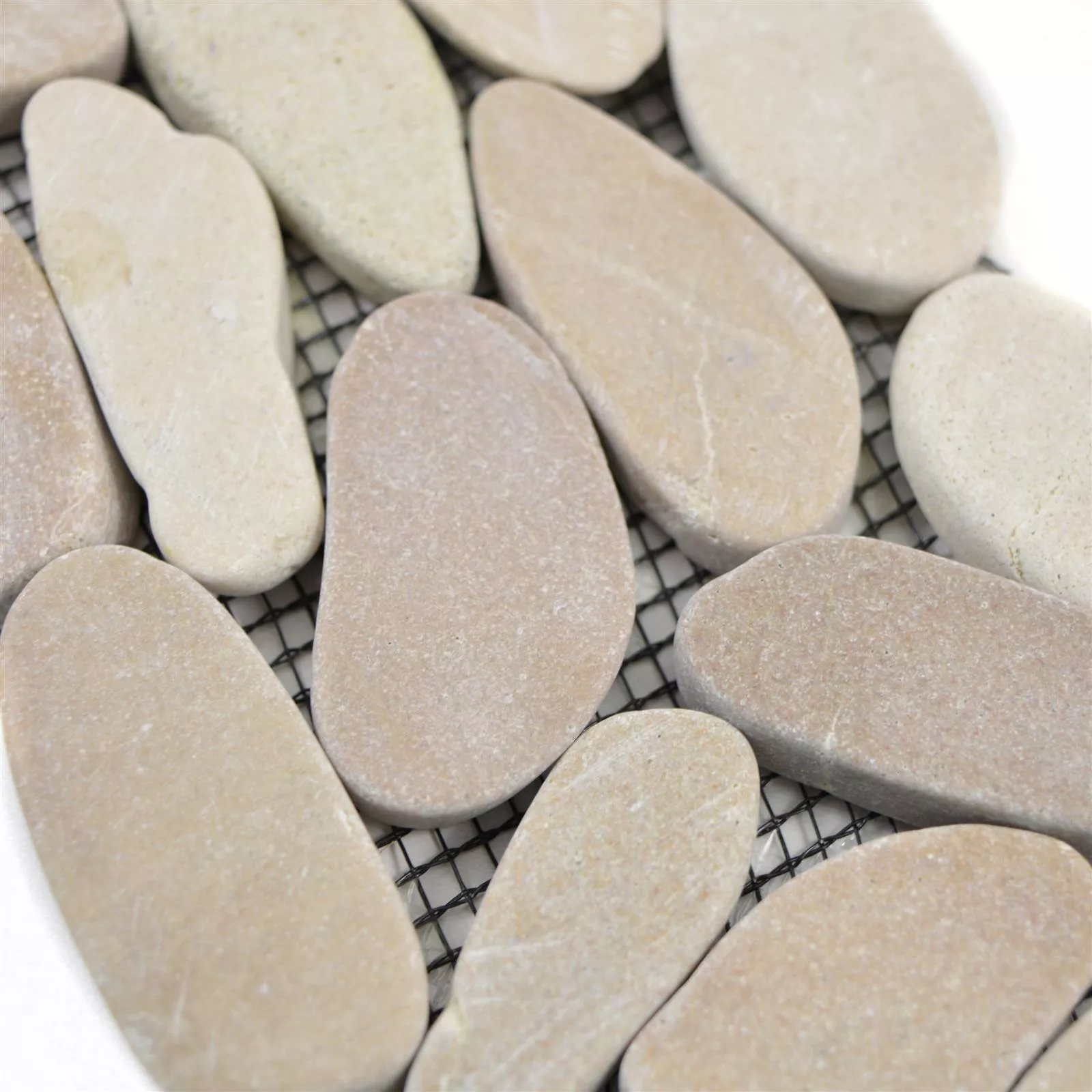 La bordure est en pierre naturelle. Le diamètre des pierres est de 8 mm. Ils sont soigneusement collés sur un passe-partout de 10 x 30 centimètres. La surface a une belle finition mate naturelle et est facile et rapide à nettoyer sans utiliser de produits chimiques. La surface de la bordure est également insensible aux rayures.