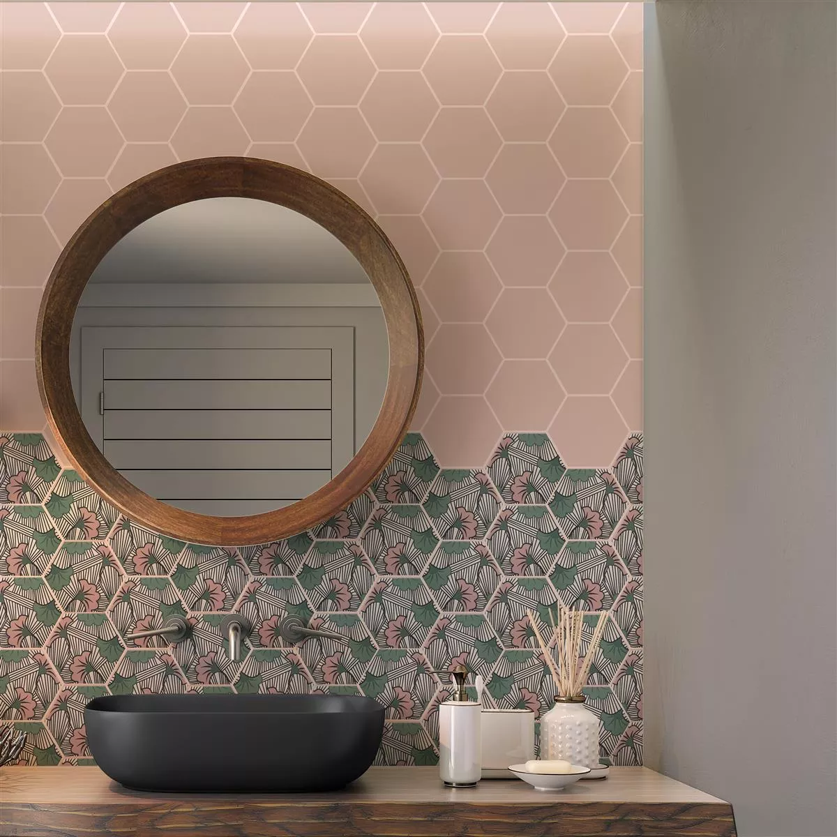 Les carreaux en grès cérame « Modena Hexagon Decor 1 » allient style et fonctionnalité. D'une épaisseur de 10 mm, ils sont robustes et conviennent parfaitement aux zones humides, douches, salles de bains, cuisines, salons et espaces intérieurs. La surface mate donne aux carreaux un aspect intemporel, tandis que la résistance au glissement R10 assure la sécurité.