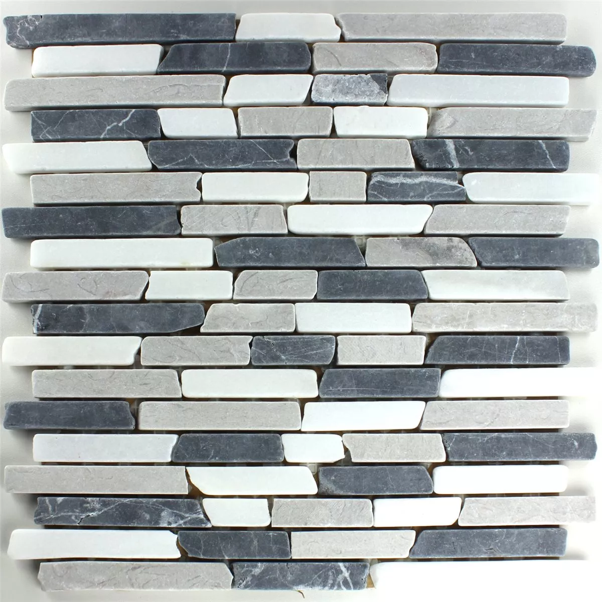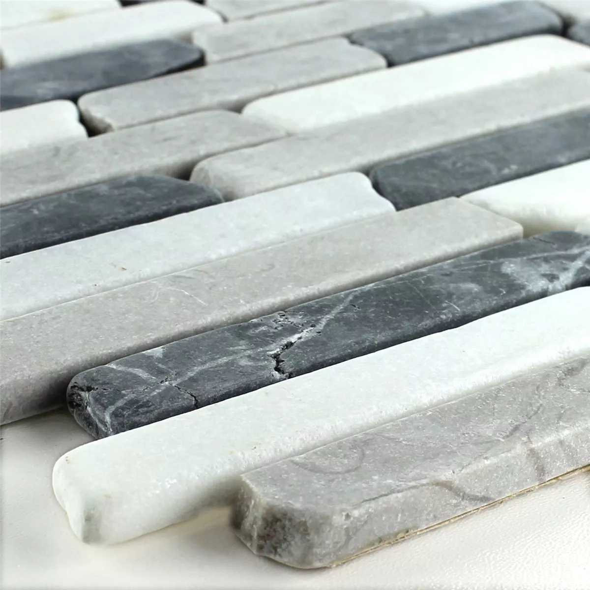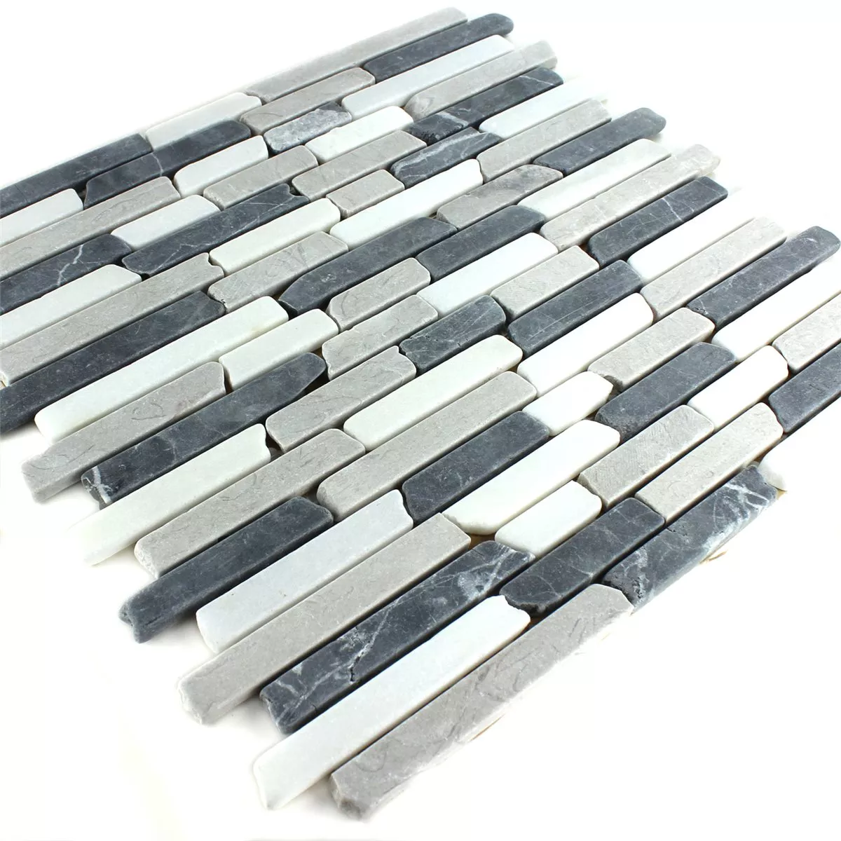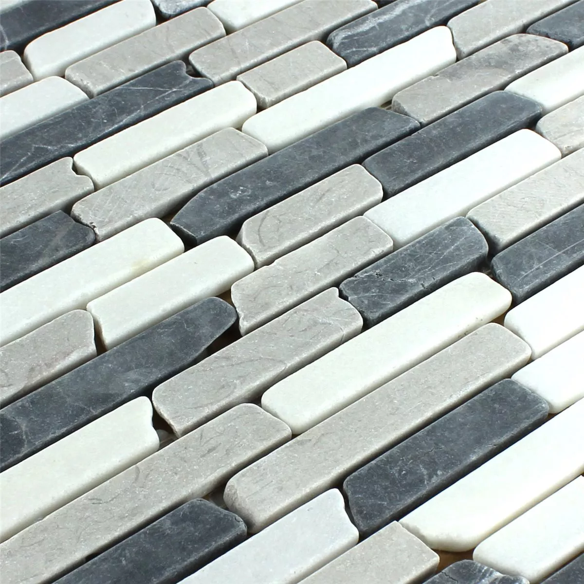 La mosaïque en marbre, de couleur Gris, Botticino avec une finition mate, a un format mat de 30,5x32,2cm et un format de pierre de 15x25mm - 105x15mm. L'épaisseur de chaque pierre est de 0,8 cm.