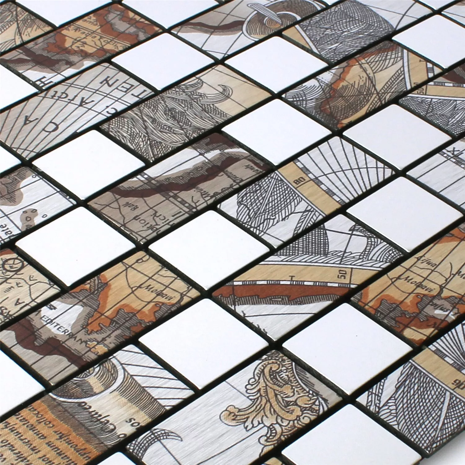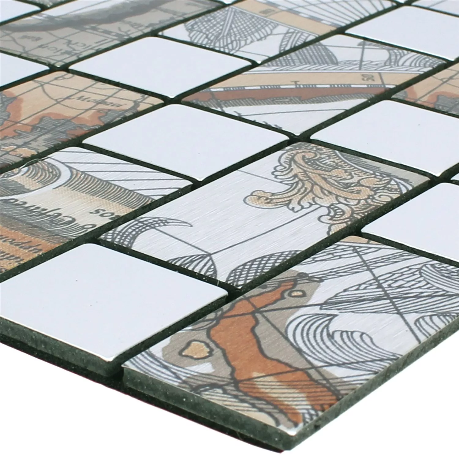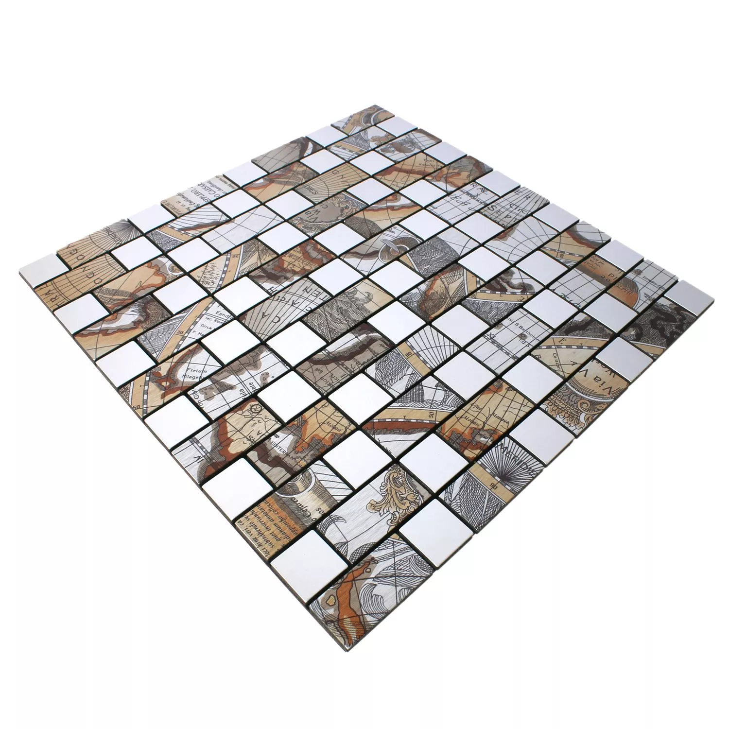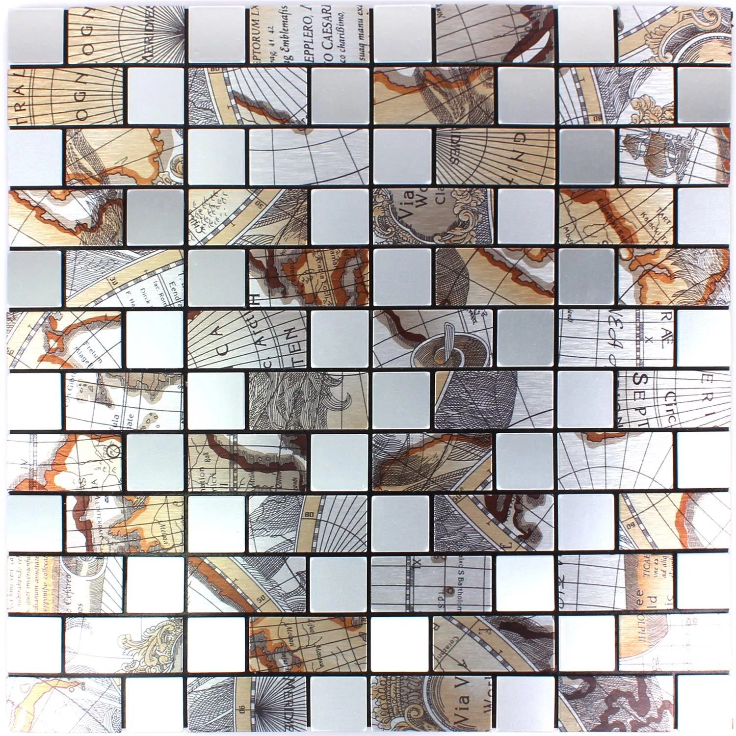 Le carreau de mosaïque rectangle argent carte du monde Pinta a une couche auto-adhésive sur la face inférieure. Cela signifie qu'aucun matériau ou adhésif supplémentaire n'est requis. Les pierres métalliques individuelles sont imprimées avec des parties de la carte du monde et ensemble, elles créent une image agréable de la carte du monde avec un look vintage. L'impression ou la surface est mate et en métal. Un tapis mesure 0,084 mètre carré et 4 mm d'épaisseur. Les carreaux de mosaïque avec une impression de carte du monde sont disponibles en formes carrées et rectangulaires. La taille de la pierre d'un carré est de 25 par 25 mm. Cependant, les pierres rectangulaires mesurent 25 par 50 mm.