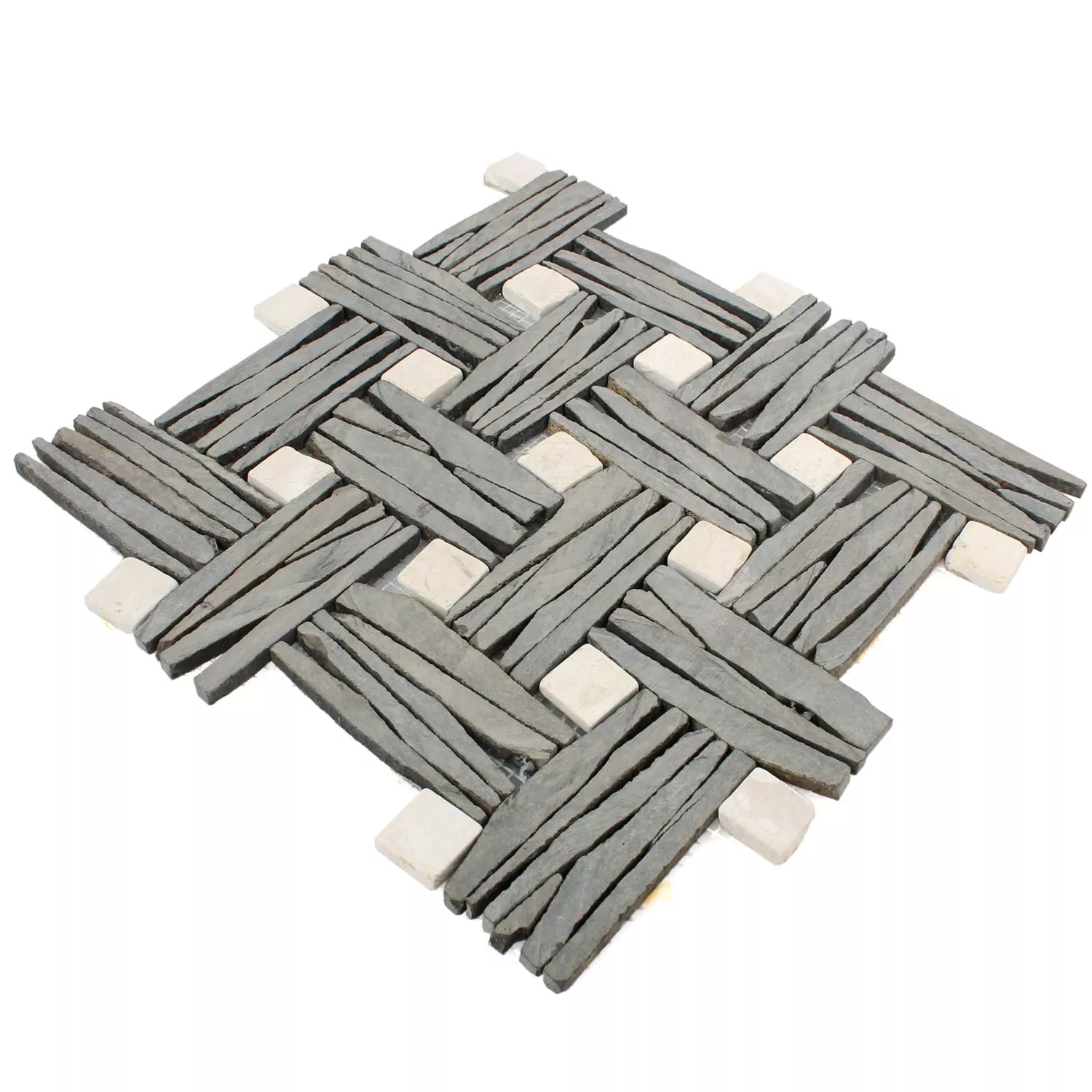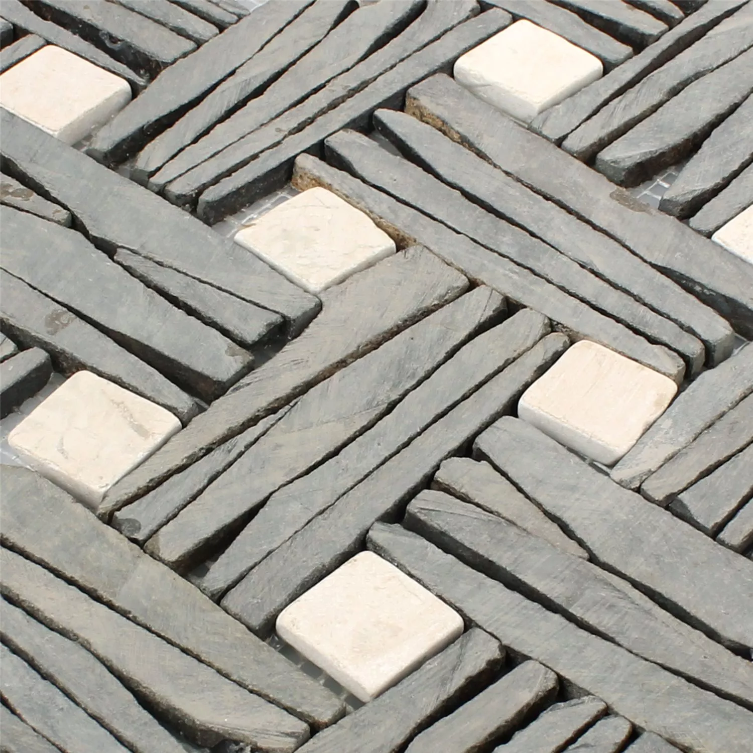 Les carreaux de mosaïque en pierre naturelle Gaming de couleur beige noir sont optiquement une caractéristique absolument naturelle. Ce sont des carreaux de mosaïque qui ont un aspect très naturel grâce aux matériaux utilisés. Ici, l'intéressé obtient quelque chose de très noble et donc de très haute qualité. Il s'agit d'ardoise avec une âme en mosaïque de marbre, la pose est très facile car la mosaïque de ces carreaux est pré-assemblée sur un passe-partout. La structure des formes donne un très beau revêtement mural, car ces carreaux de marbre ardoise sont des carreaux de mosaïque aux couleurs élégantes noir et beige.