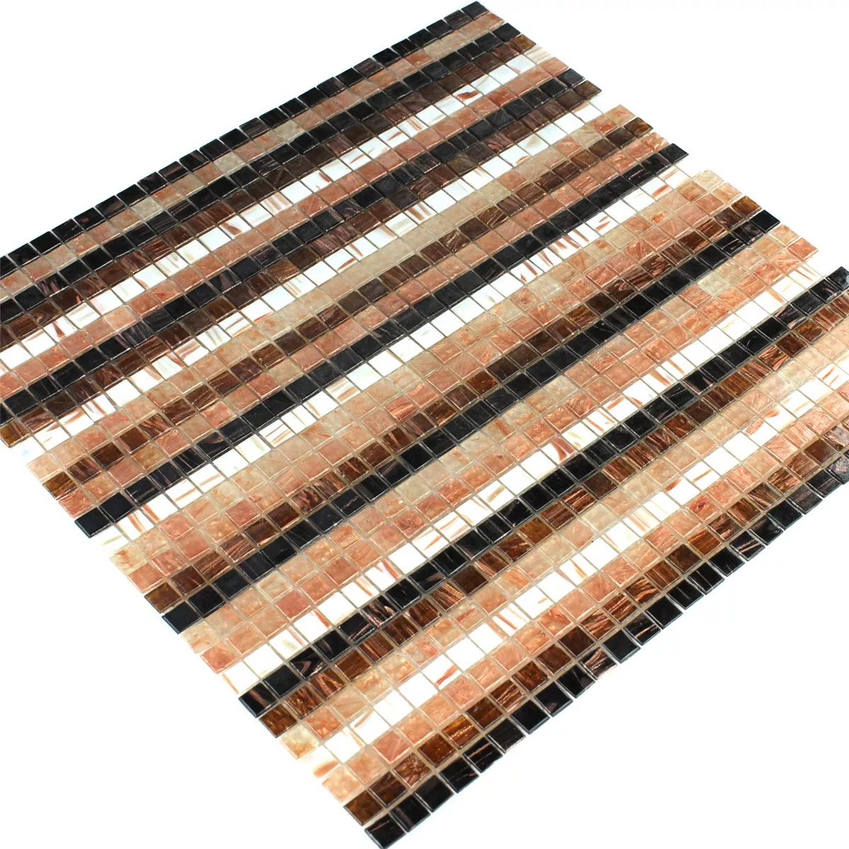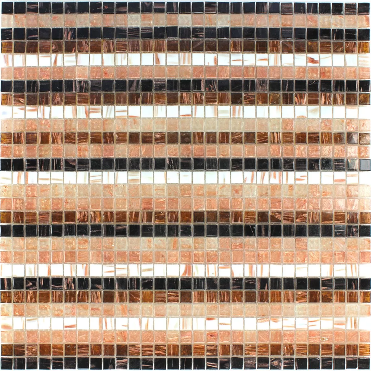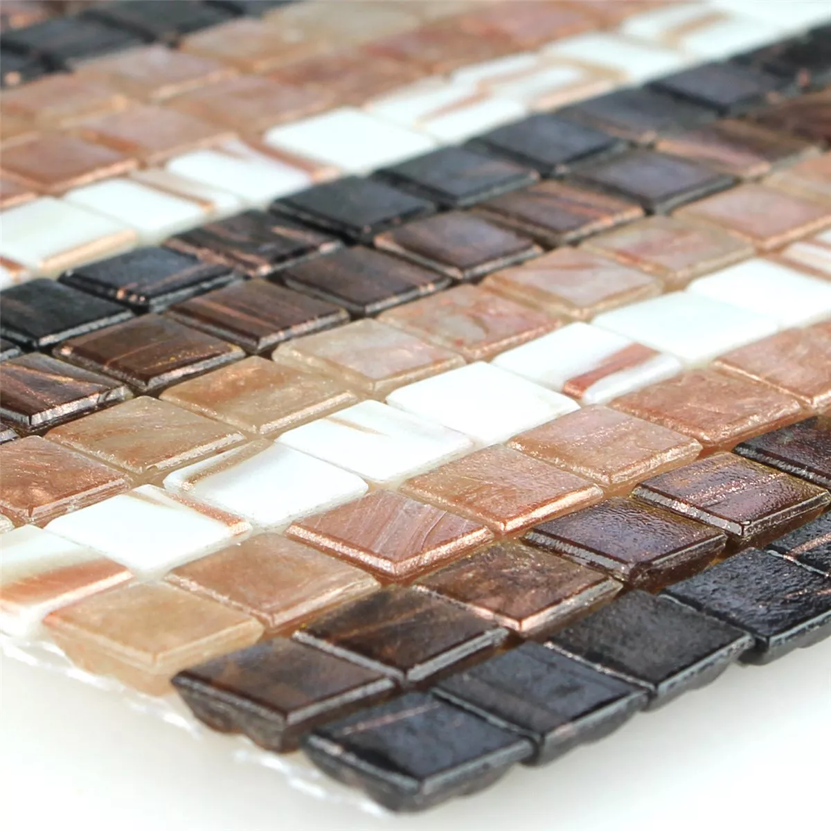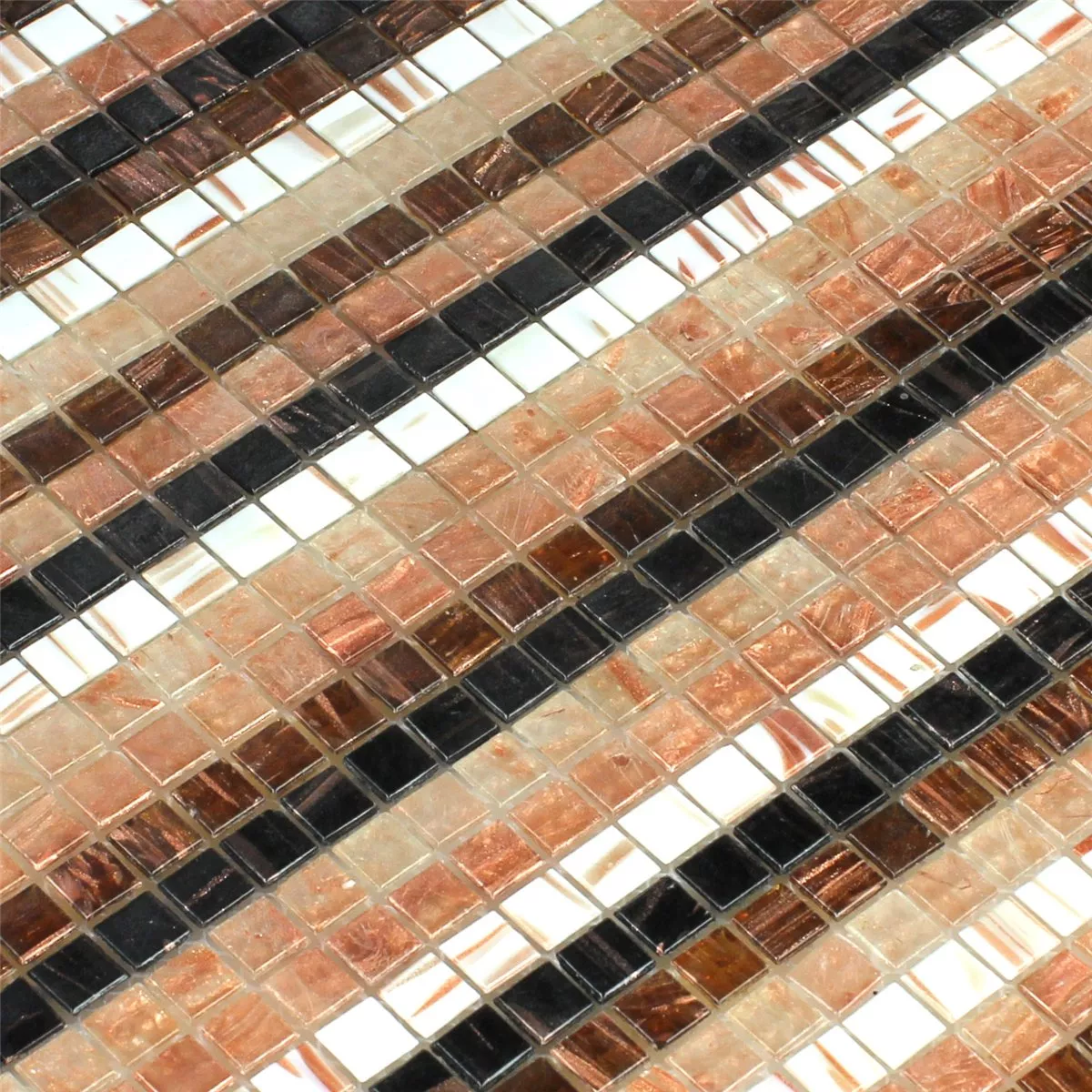 La mosaïque de verre , en noir, marron, beige, blanc et finition de surface mate effet doré, a un format mat de 32,5x30,5cm et un format de pierre de 1x1cm. L'épaisseur de chaque pierre est de 0,4 cm.