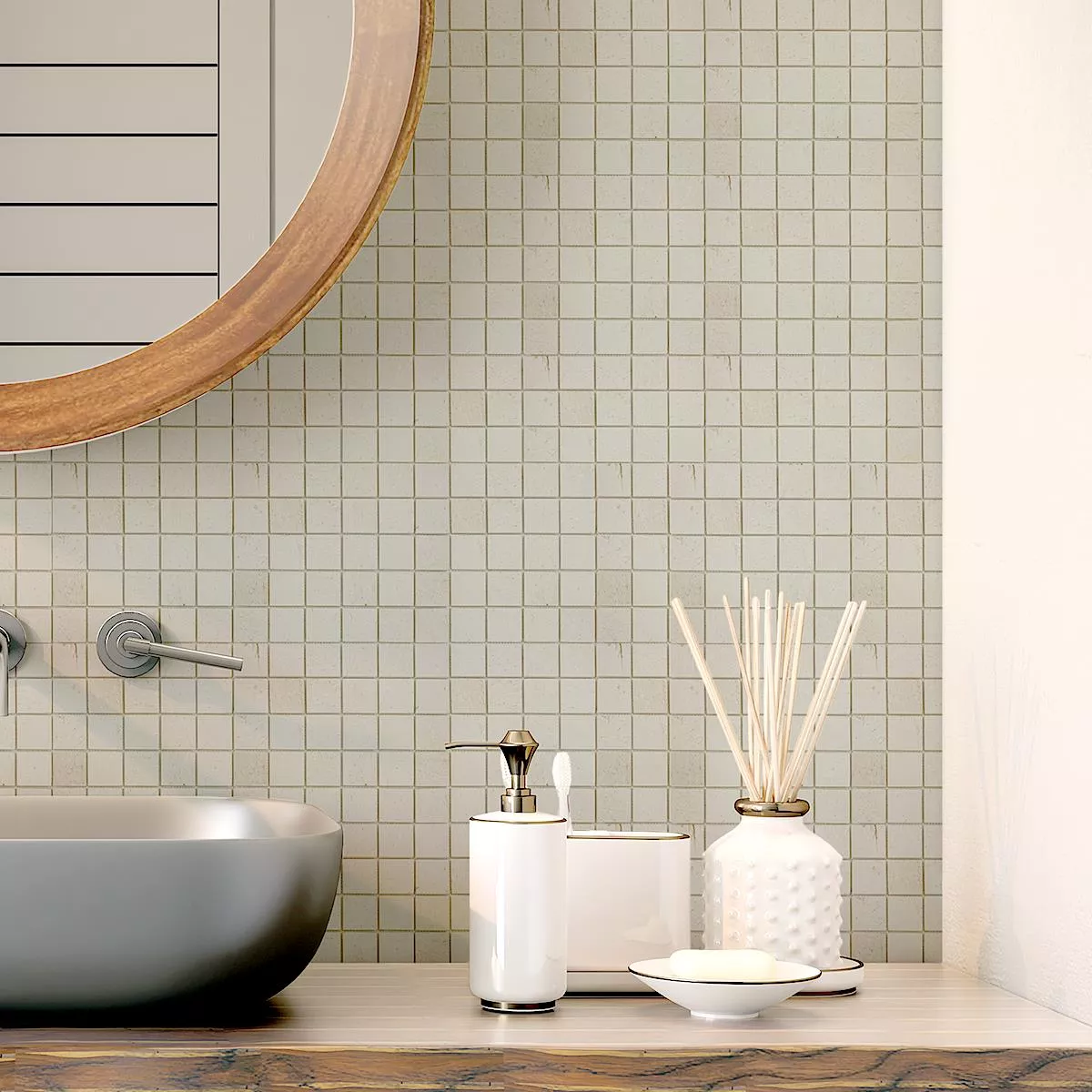 Chaque carreau et chaque mosaïque ont des exigences différentes pour la coupe, la pose et le traitement en raison des caractéristiques individuelles des matériaux et des conditions d'utilisation. Veuillez demander à un expert local une pose correcte et sûre de vos mosaïques ou carreaux. Nous ne sommes pas responsables de l'utilisation non professionnelle et de la fabrication défectueuse des matériaux de construction.