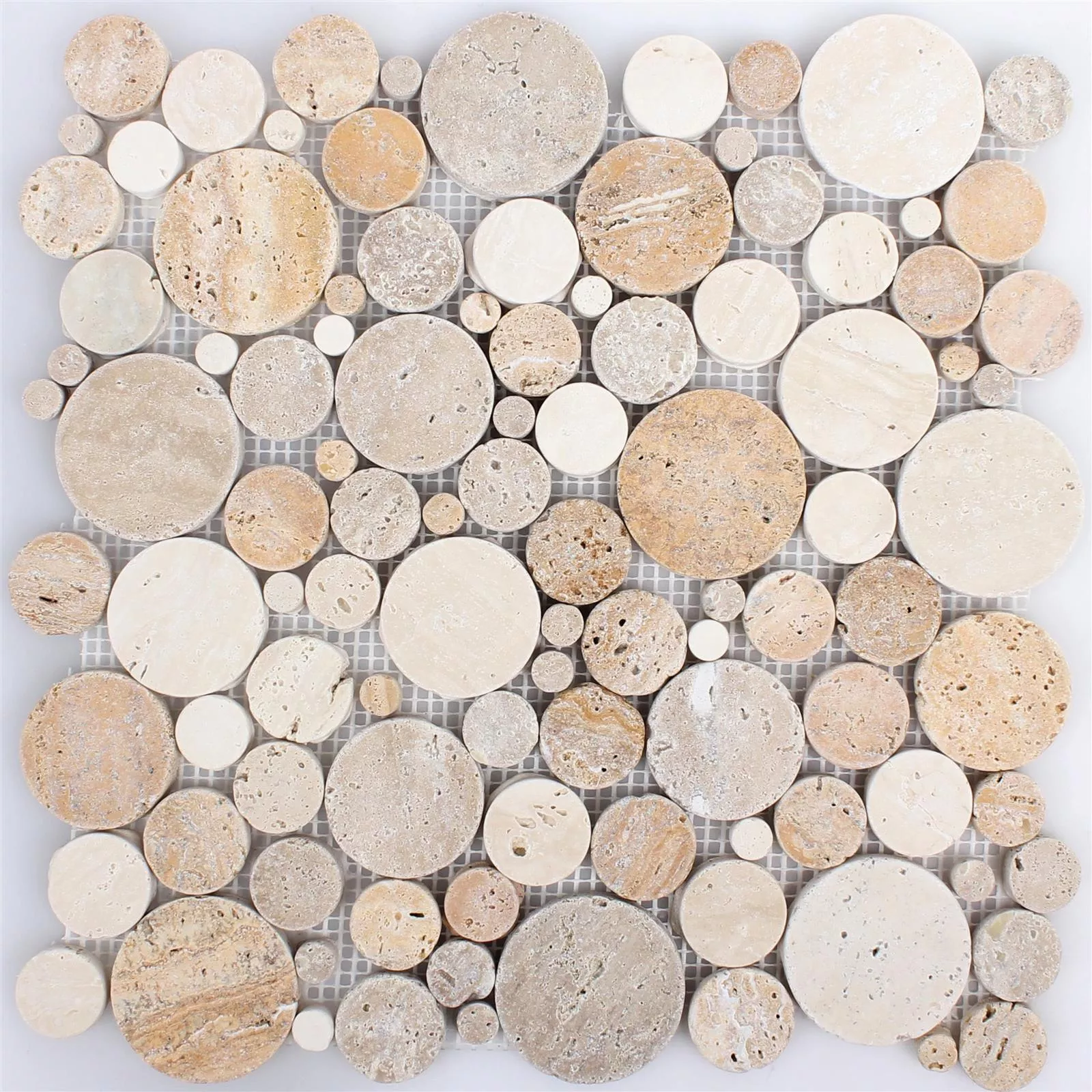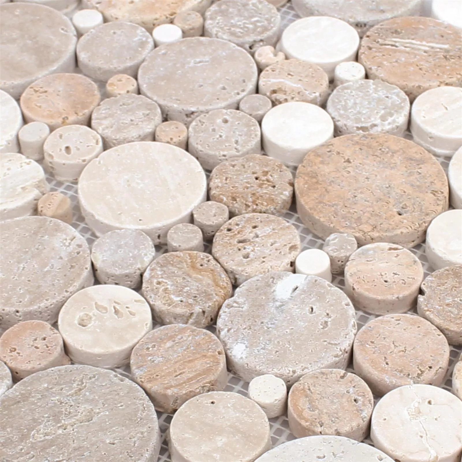 La surface mate et roulée est très attrayante et extrêmement moderne. Les pierres circulaires de différents diamètres sont de très haute qualité et sont un point culminant dans chaque salle de bain. La mosaïque en pierre naturelle en travertin Franklin peut être utilisée comme carrelage mural, carrelage de sol ou carreau de mosaïque. De plus, la mosaïque en pierre naturelle travertin Franklin est proposée en trois couleurs claires différentes afin que vous puissiez apporter votre propre goût: or, beige et blanc.