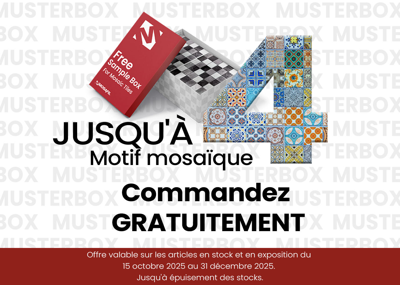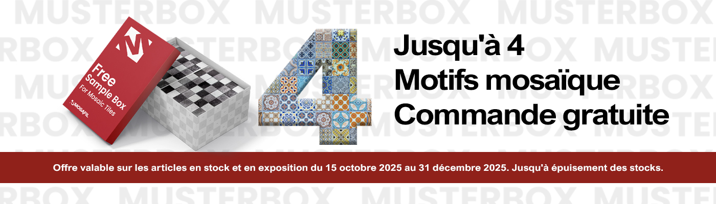 Nous proposons en permanence un large choix de mosaïques et de carreaux de haute qualité pour la salle de bain et les toilettes, les piscines, les couloirs, les pièces de vie ainsi que les terrasses et allées. Chez nous, vous trouverez différents carreaux, carreaux muraux, carreaux de sol, grès cérame, bordures et mosaïques en verre, tels que mosaïques en pierre naturelle, parements muraux, revêtements, mosaïques pour piscines, galets de rivière, mosaïques aspect bois, mosaïques métalliques, mosaïques en pierre naturelle, mosaïques en acier inoxydable, mosaïques en aluminium, éclats de marbre, mosaïques en marbre, mosaïques de cuisine, carreaux de cuisine, carreaux en pierre naturelle, travertin, ardoise et carreaux de salle de bain. Mosaïques de salle de bain avec de nombreuses possibilités de conception. Inspirez-vous des différentes formes, matériaux et couleurs ! Parcourez nos catégories de produits 24h/24, que nous mettons continuellement à jour avec de nouveaux articles. Commandez facilement depuis chez vous les carreaux ou mosaïques de votre choix – en échantillon ou en quantité nécessaire. Nous livrons rapidement et en toute sécurité dans toute l’Europe. Nous vous conseillons volontiers personnellement et créons avec vous des offres sur mesure.